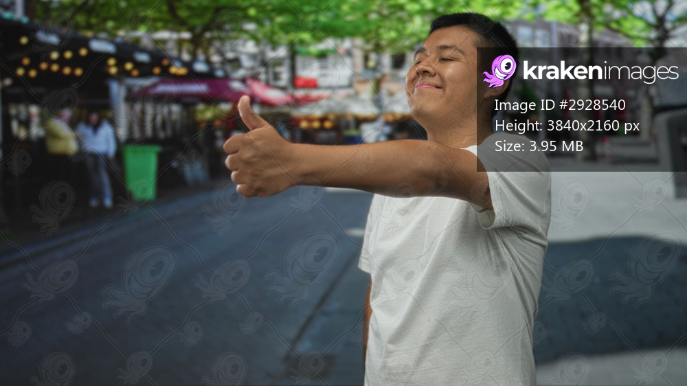 Man giving thumbs up with outstretched hand on a busy city street wearing white t shirt; optimism encouragement.