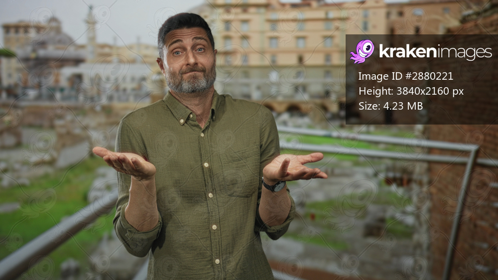 Man giving thumbs up and pointing finger at building among roman ruins outdoors, smiling and gesturing to camera; joy travel.