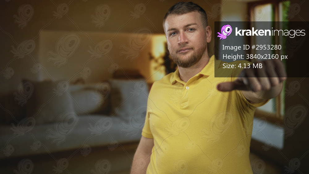 Man giving thumbs up to camera in building living room interior, wearing yellow polo shirt with beard and relaxed pose; casual home confidence.