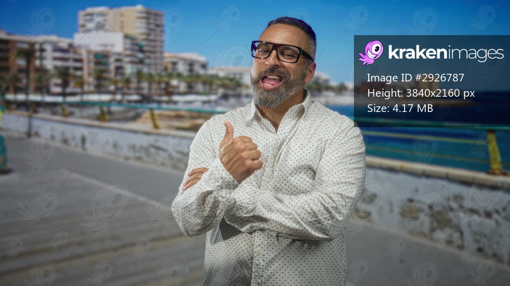 Man giving thumbs up with visible thumb and tongue out on sunny seaside street promenade by a railing and buildings; playful confidence.