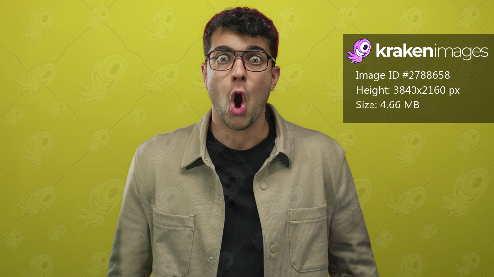 Man with glasses adjusts them on background, spectacles highlight young hispanic features with colored yellow expression.