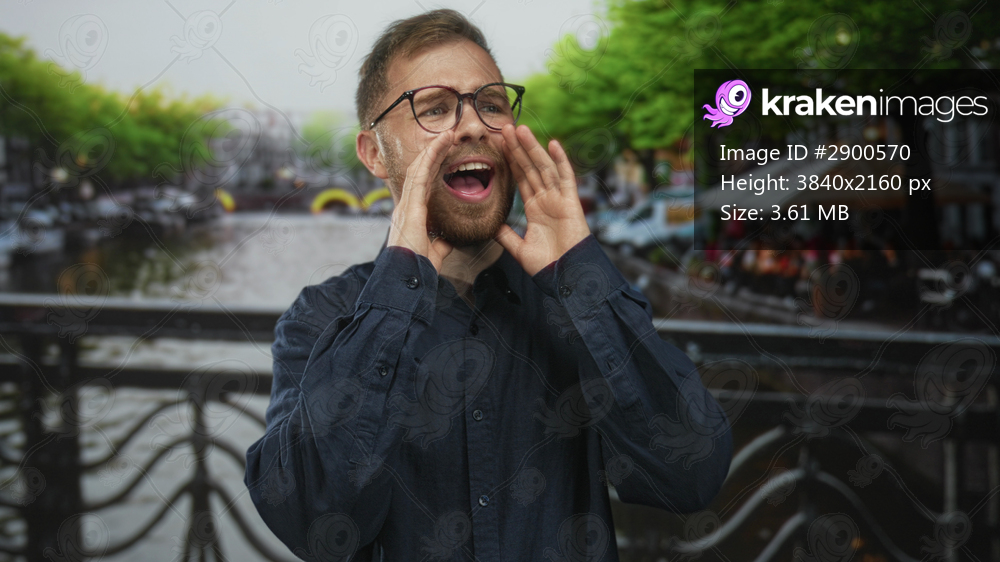 Man with glasses and beard cupping hands to mouth on a street canal bridge in amsterdam near cafe terraces; enthusiasm celebration.