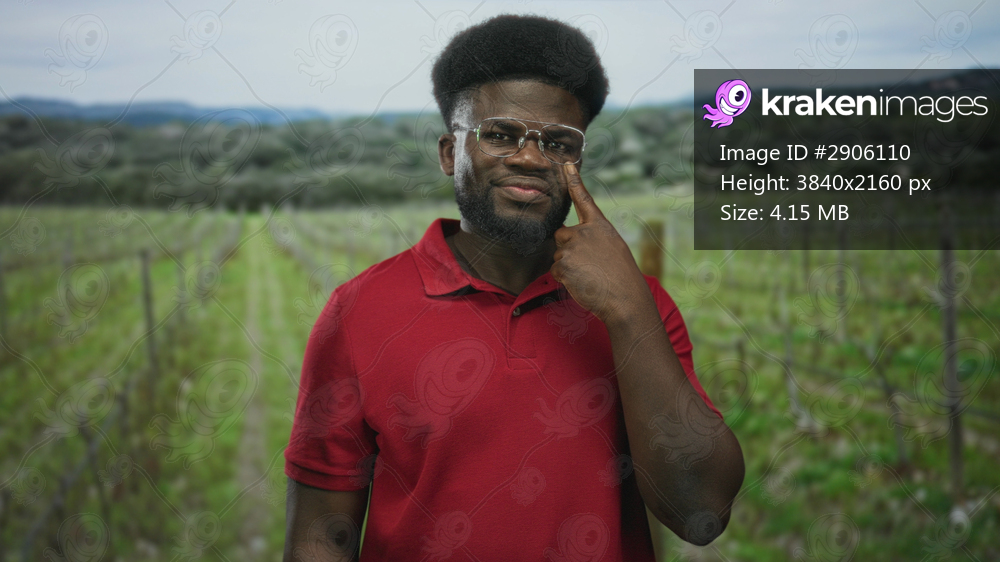 Man with glasses and beard, finger to cheek near eye in forest vineyard rows wearing red polo; pensive reflection.