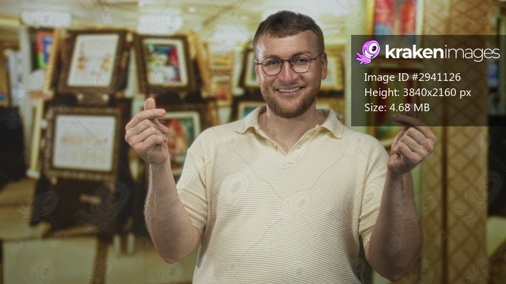 Man with glasses and beard making finger heart gesture with both hands in art gallery building among framed paintings; affection.