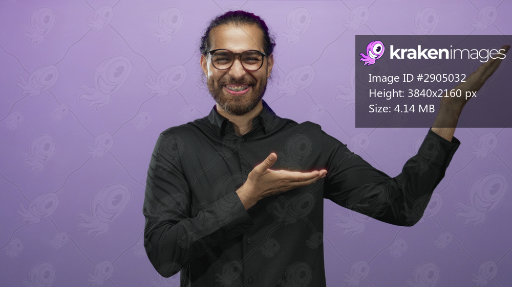 Man with glasses and beard showing braces, smiling and presenting open hands in a purple studio; friendly confidence.