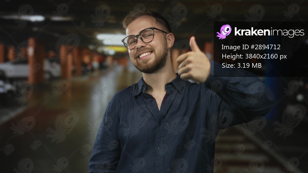 Man with glasses and beard smiling and giving thumbs up inside parking building near cars wearing a navy shirt; optimism.