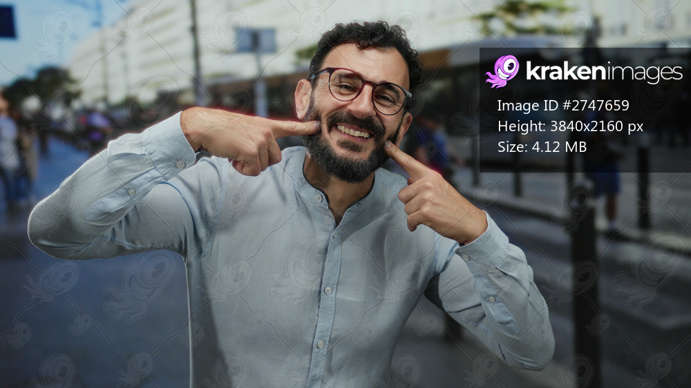 Man with glasses and beard smiling on a busy street outdoors, capturing a cheerful and lively urban atmosphere.