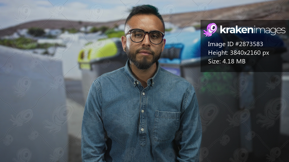 Man with glasses and beard standing by recycling containers on a street, face visible and looking at camera; quiet contemplation.