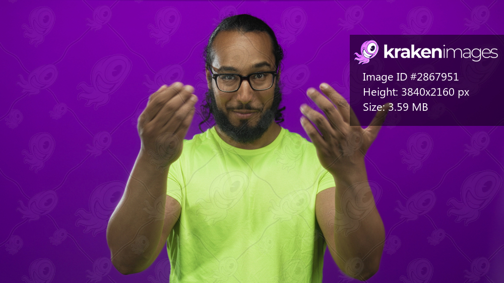 Man with glasses and beard wearing neon green shirt, pointing with both hands and smiling directly at camera in studio with purple backdrop; friendly invitation. - Kraken Images
