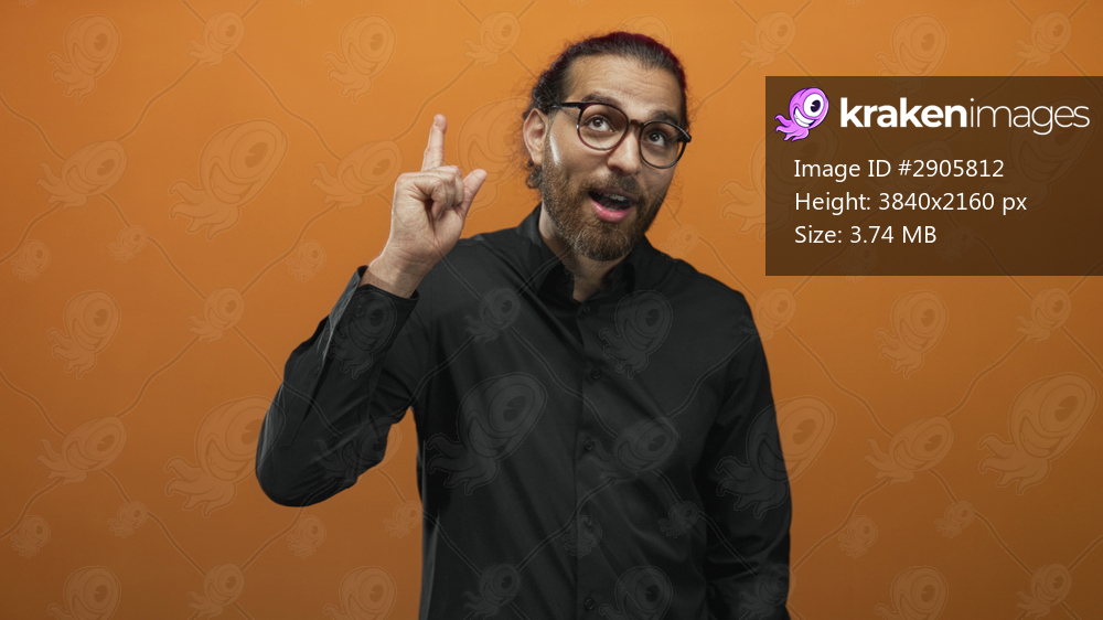 Man with glasses and braided hair pointing index finger upward while looking up in orange studio; inspiration idea.