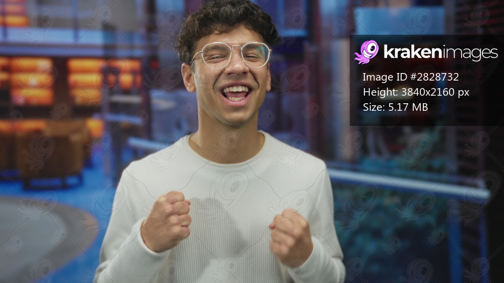 Man with glasses clenches fists in hotel lobby near lounge seating under soft lighting; confidence enthusiasm energy motivation.