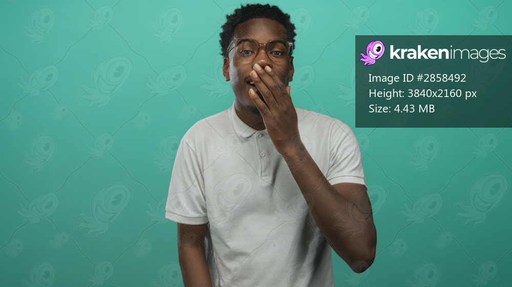 Man with glasses covers mouth with hand in studio setting capturing subtle gesture expression; surprise introspection.