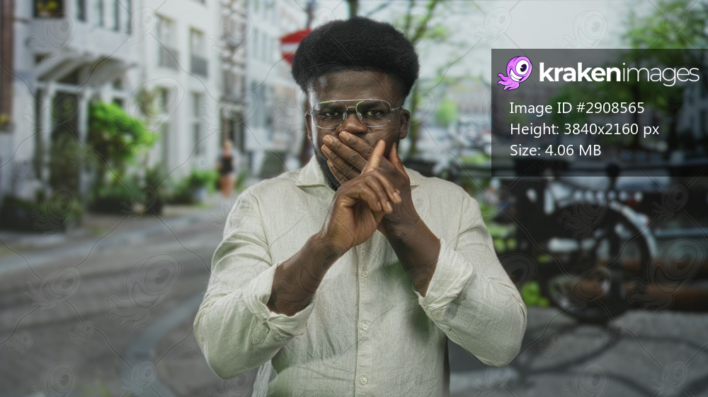 Man with glasses covers mouth with hands on street near canal bridge and bicycle rack; silence secrecy hush.