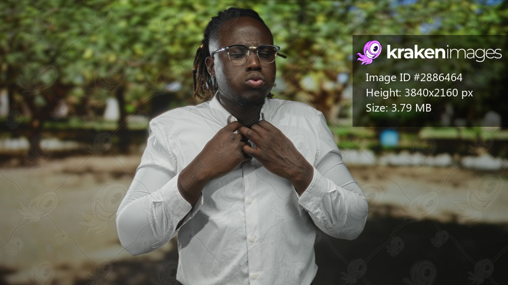 Man with glasses and dreadlocks making hand to chest gesture and pursed lips in forest; self expression confidence.