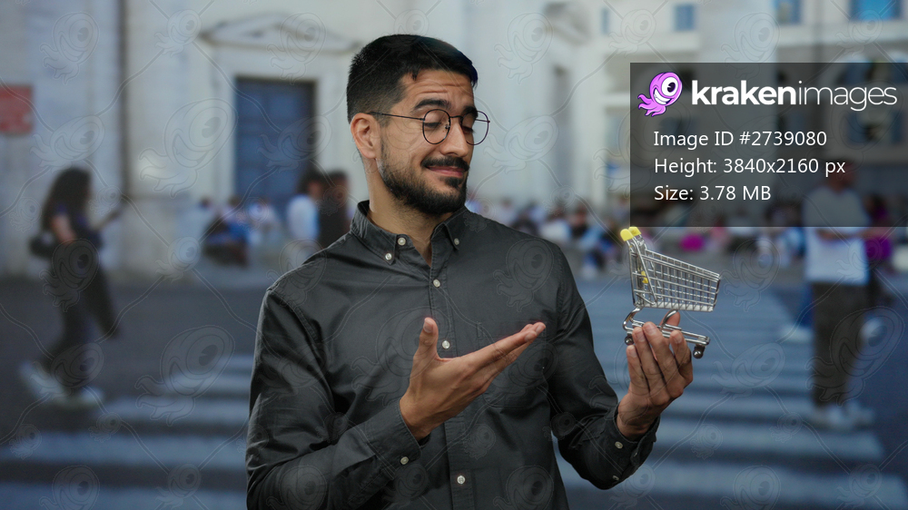 Man with glasses examines small shopping cart on bustling city street during day showcasing urban lifestyle in background.