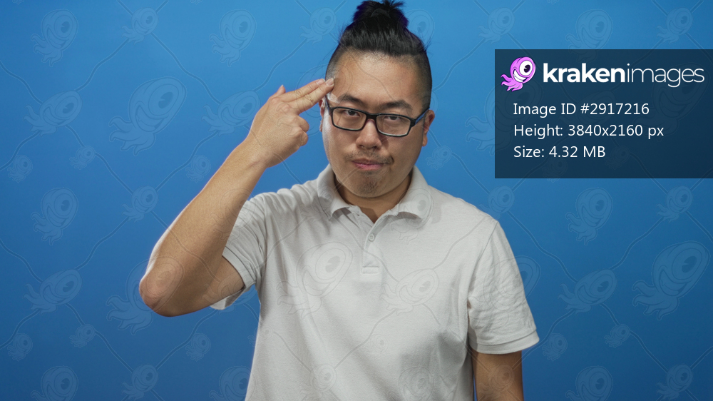 Man with glasses and eyes closed, wearing white polo and making a flicking three finger gesture in a blue studio; sleepiness.