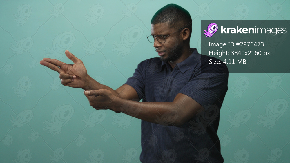 Man with glasses forms finger gun with both hands, pointing and adjusting wrist while staring ahead in studio against teal backdrop; concentration.