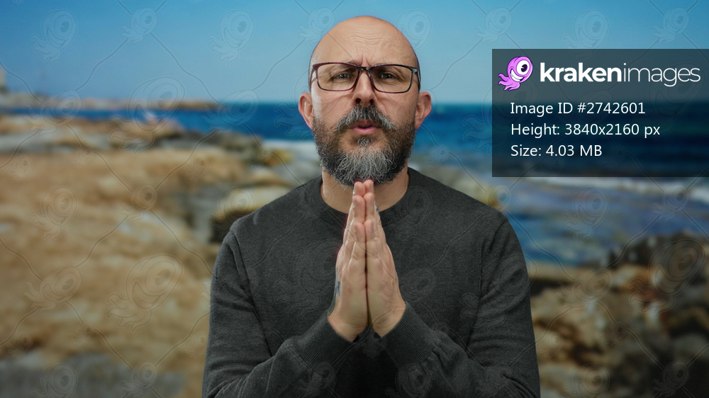 Man with glasses gestures by the seaside, expressing with hands towards the ocean on a sunny day, conveying emotion and thought in a serene outdoor beach environment. - Kraken Images