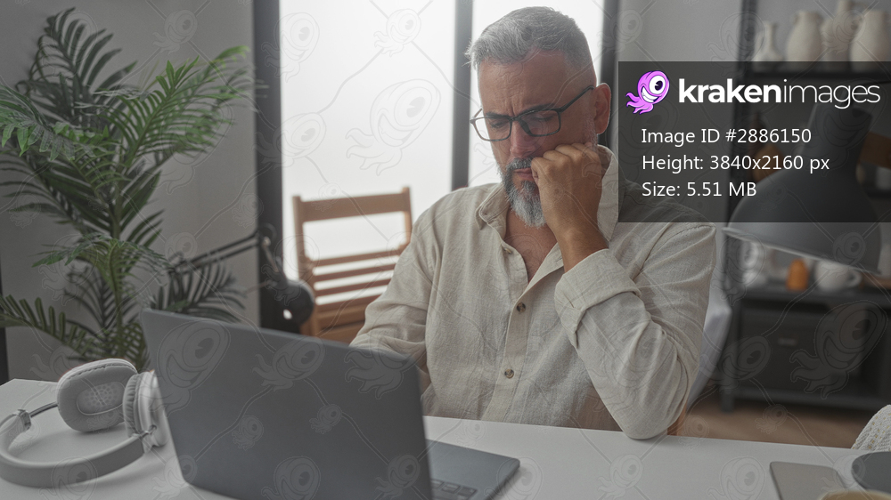 Man with glasses and gray beard typing on laptop at desk in studio office beside lamp and plant; concentration productivity.