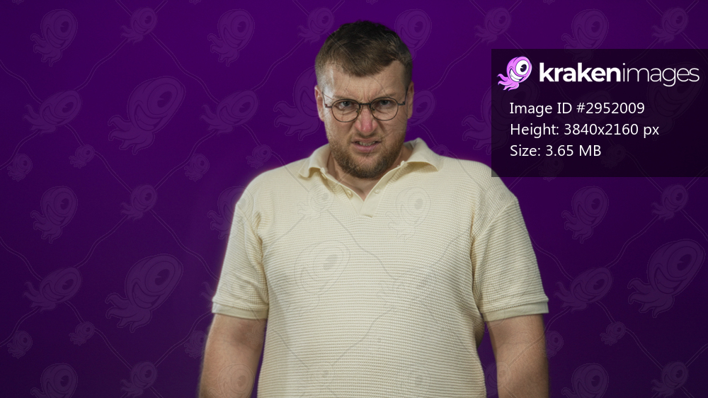 Man with glasses grimacing and squinting in studio against purple backdrop wearing cream polo shirt, hands down by sides; disgust discomfort.