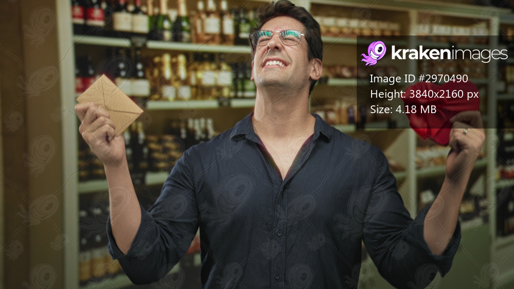 Man with glasses holding a red heart box and kraft envelope, mouth open shouting by store shelves in building; joy surprise romance.