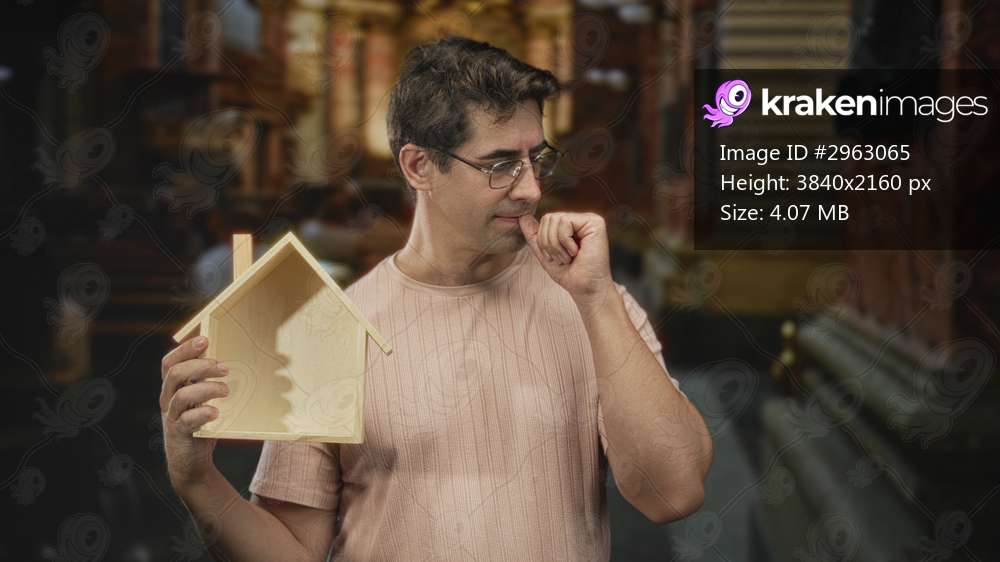Man with glasses holding a wooden house model, biting fingernail and studying it inside an ornate building; uncertainty contemplation.