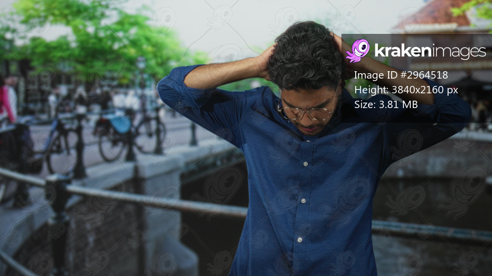 Man with glasses holding hands to head on street bridge near canal, blue shirt and steady posture; quiet introspection anxiety.