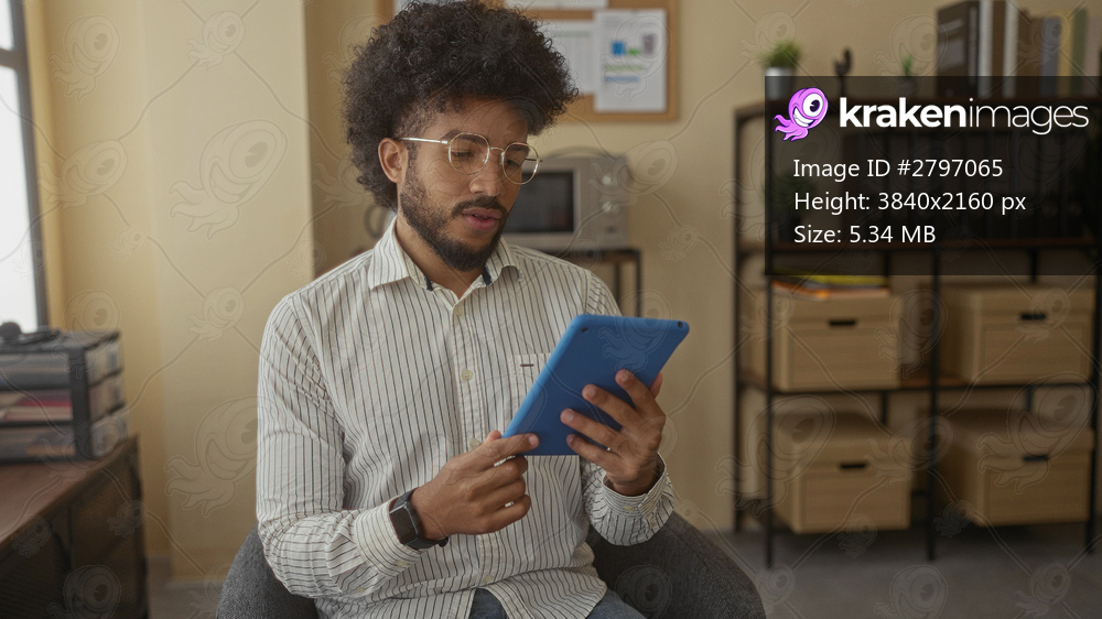 Man with glasses holding tablet in modern office room looking pensive while sitting on chair surrounded by shelves and decor in a casual work environment. - Kraken Images