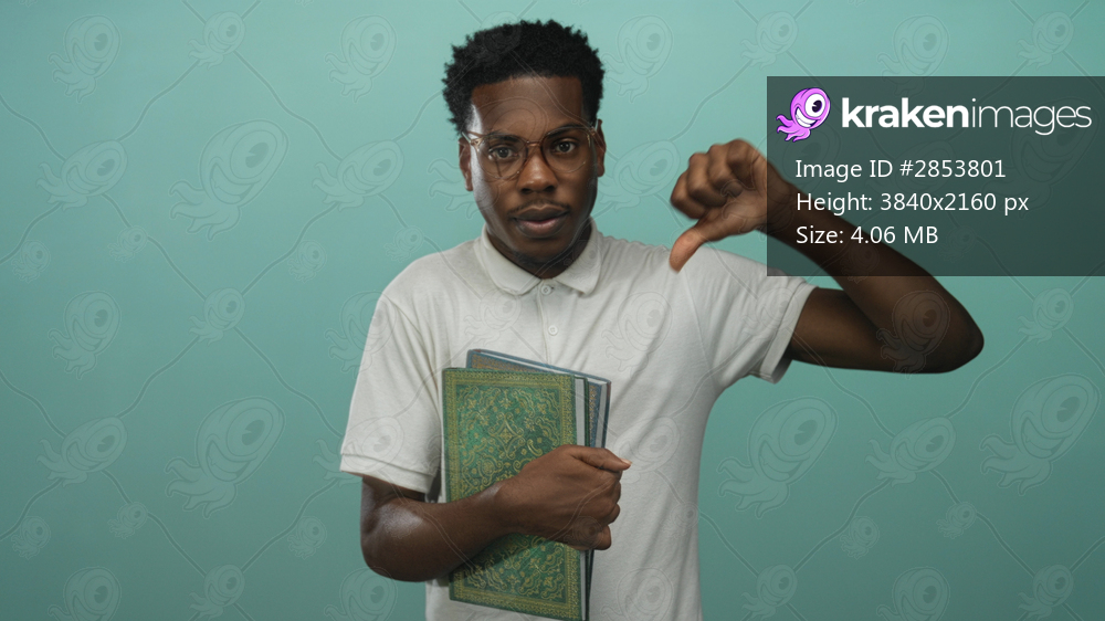 Man with glasses holds patterned binder with thumb down gesture in mint green studio; disapproval.