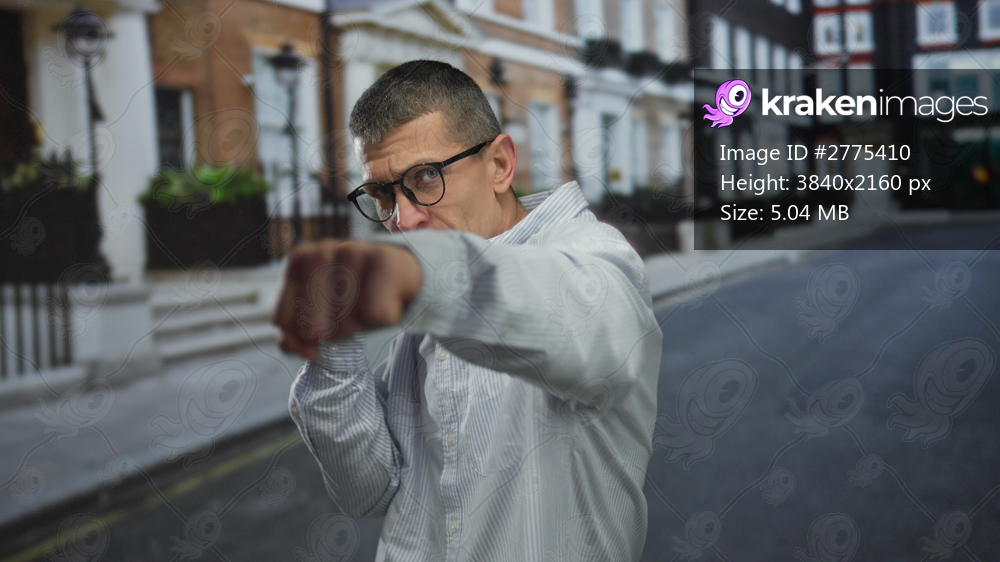 Man with glasses in fighting stance on a european street, exuding determination and focus, against an urban backdrop of classic architecture and lampposts. - Kraken Images