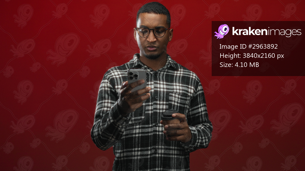 Man with glasses in plaid shirt looking down at smartphone while holding a paper coffee cup against a red studio backdrop; concentration morning routine. - Kraken Images