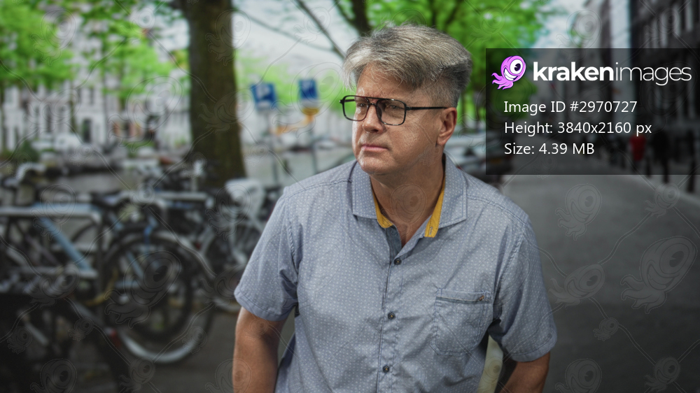 Man with glasses leaning forward, looking sideways on a street with parked bicycles and canal buildings; pensive reflection.