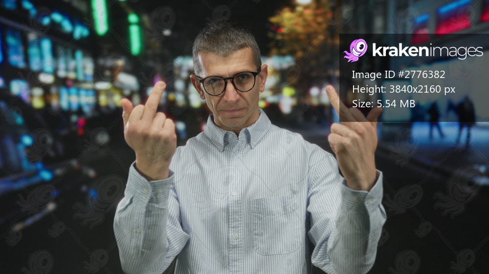 Man with glasses making offensive gesture on illuminated city street at night showing defiance and attitude in an urban setting outdoors.