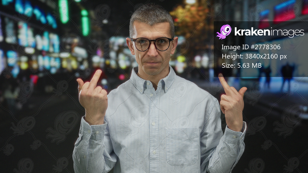 Man with glasses making offensive gesture on illuminated city street at night showing defiance and attitude in an urban setting outdoors.