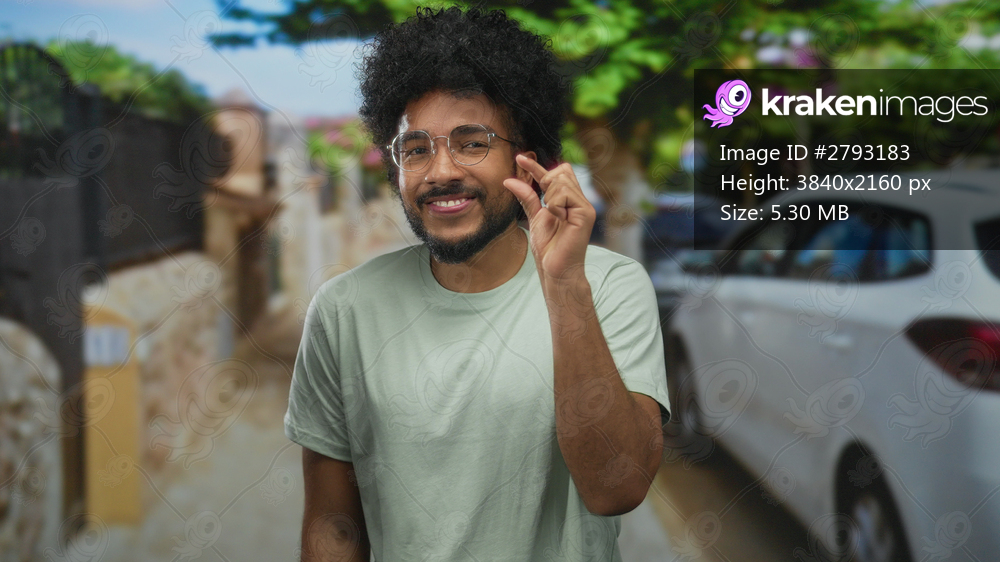 Man with glasses making small gesture on a sunny city street, green trees and parked cars in background indicating outdoor urban scene.