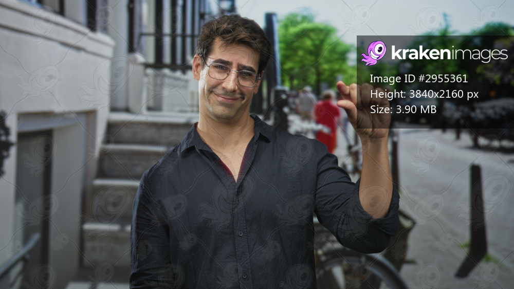 Man with glasses pinching fingers to show small size beside bicycle and steps on a street; mild skepticism.