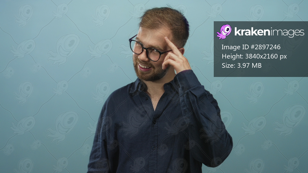 Man with glasses pointing finger in studio against light blue background, smiling and leaning slightly forward; friendly confidence.