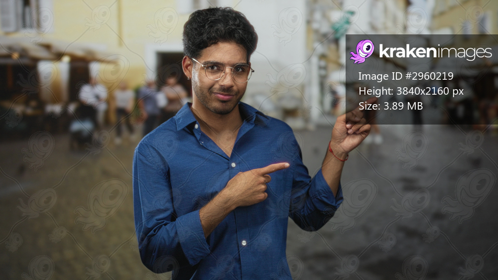 Man with glasses pointing right and smiling, hand raised and adjusting sleeve on a cobblestone street with outdoor cafes and blurred pedestrians; confidence. - Kraken Images