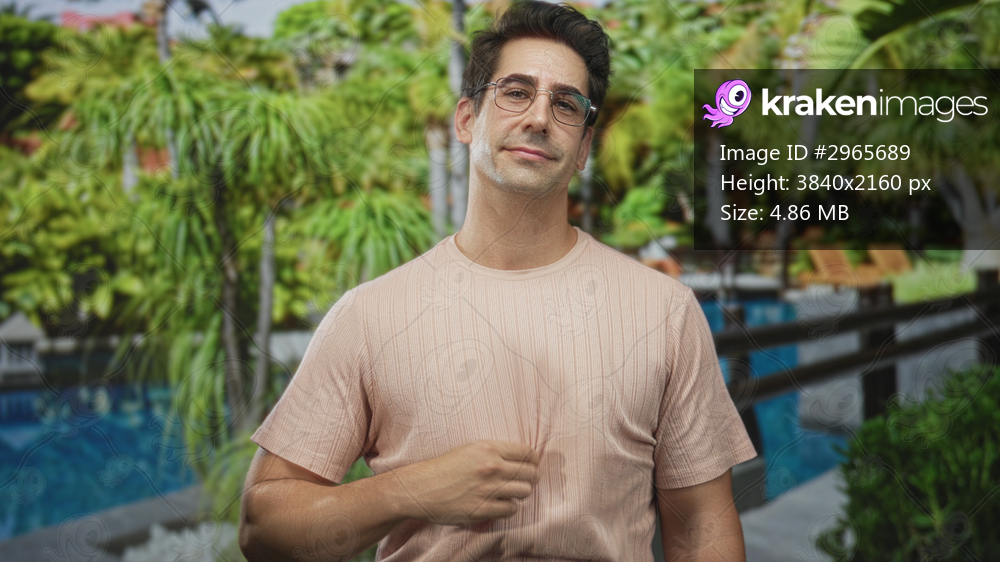 Man with glasses pulling his shirt at chest by a tropical resort pool walkway next to a building; contentment.