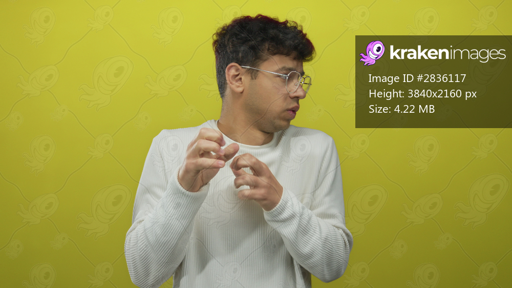 Man with glasses raises clenched fists and tense posture in bright yellow studio as if ready to strike; fear.