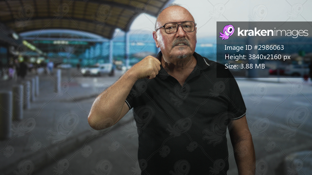Man with glasses raising fist forward at airport dropoff lane, visible bare hand and forearm; determination defiance alertness.
