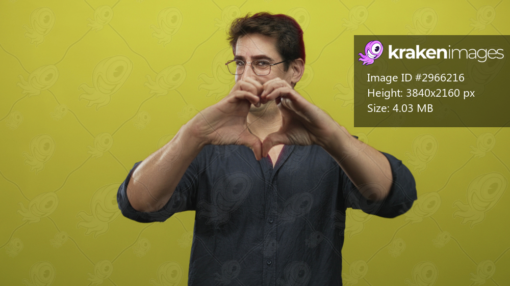 Man with glasses and rolled shirt sleeves forms heart with hands while smiling at camera in a studio; warmth and connection.