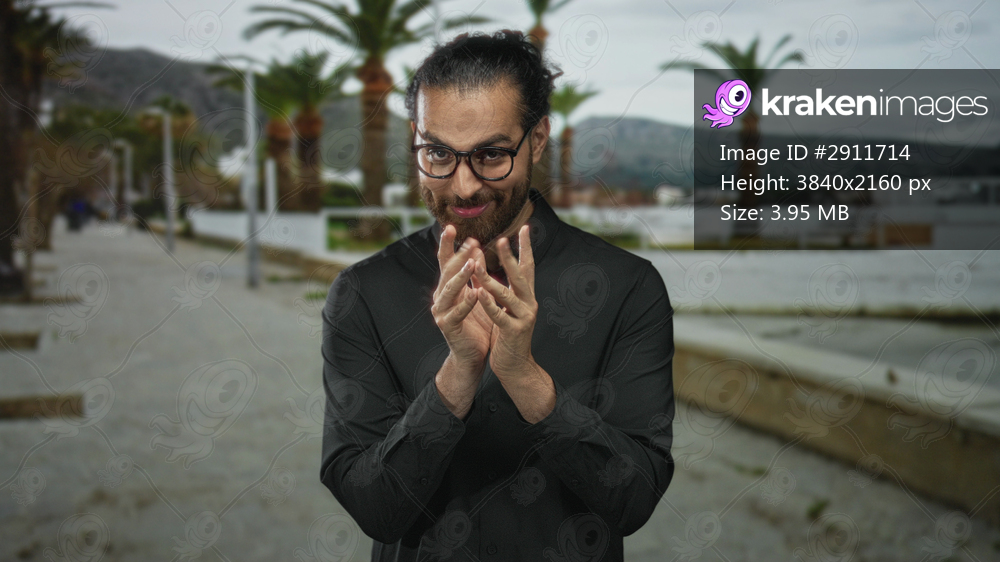Man with glasses rubbing hands and pressing fingertips together on a street promenade by palm trees and waterfront; calm reflection.