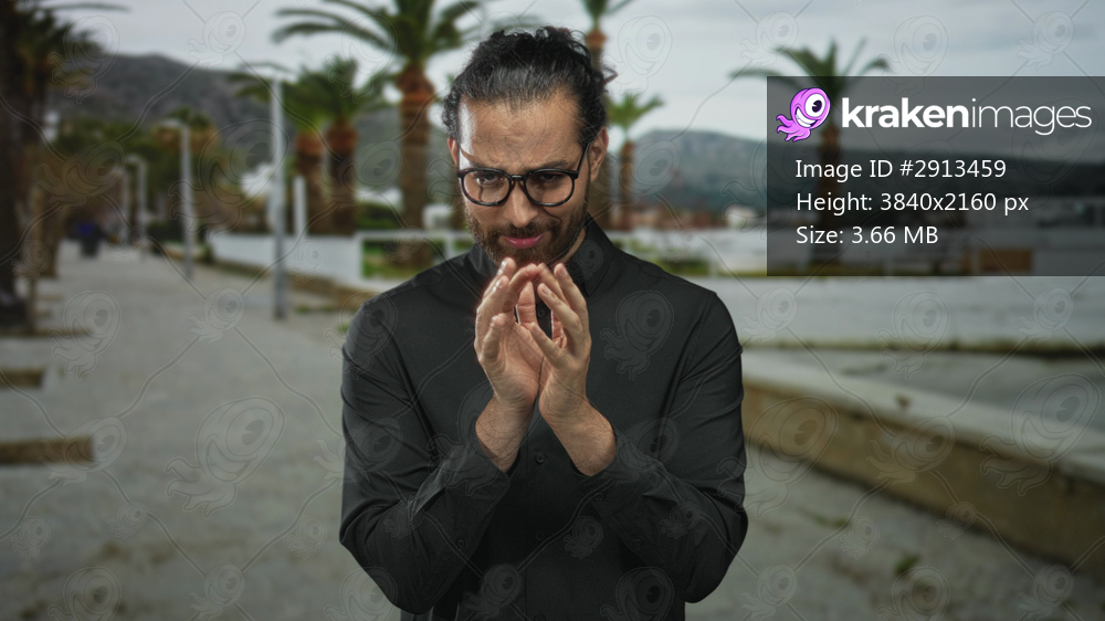 Man with glasses rubbing hands and pressing fingertips together on a street promenade by palm trees and waterfront; calm reflection.