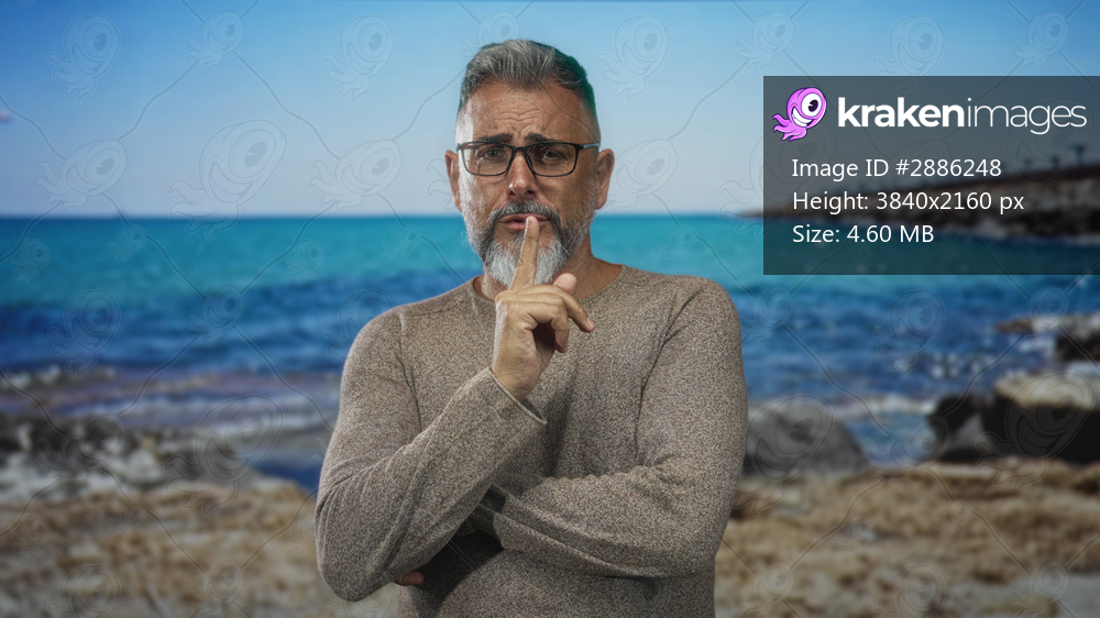 Man with glasses and salt and pepper beard, arms crossed, slight smile, standing on a rocky coastal street beside turquoise sea and stone pier; confidence. - Kraken Images