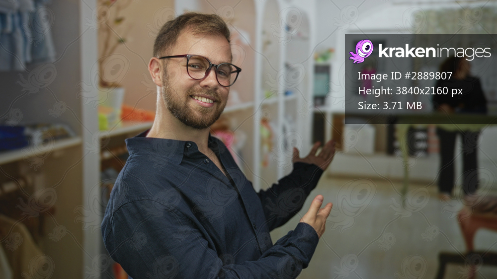 Man with glasses and short beard smiling and presenting open hands toward clothing displays in a shop building; welcoming customer service.