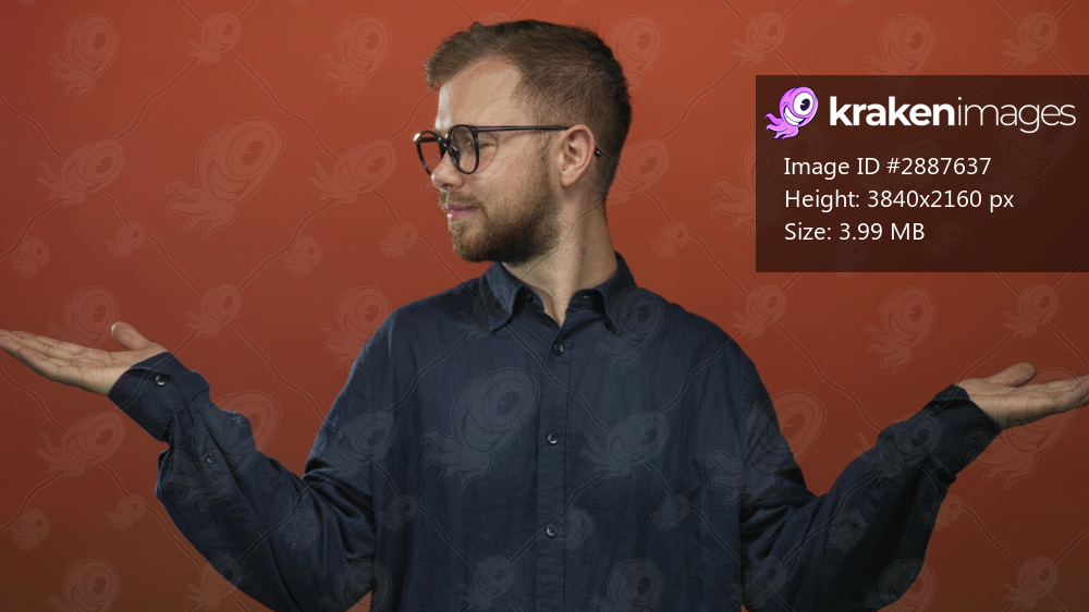 Man with glasses showing palms up shrug in studio against orange backdrop; uncertainty choice pondering.