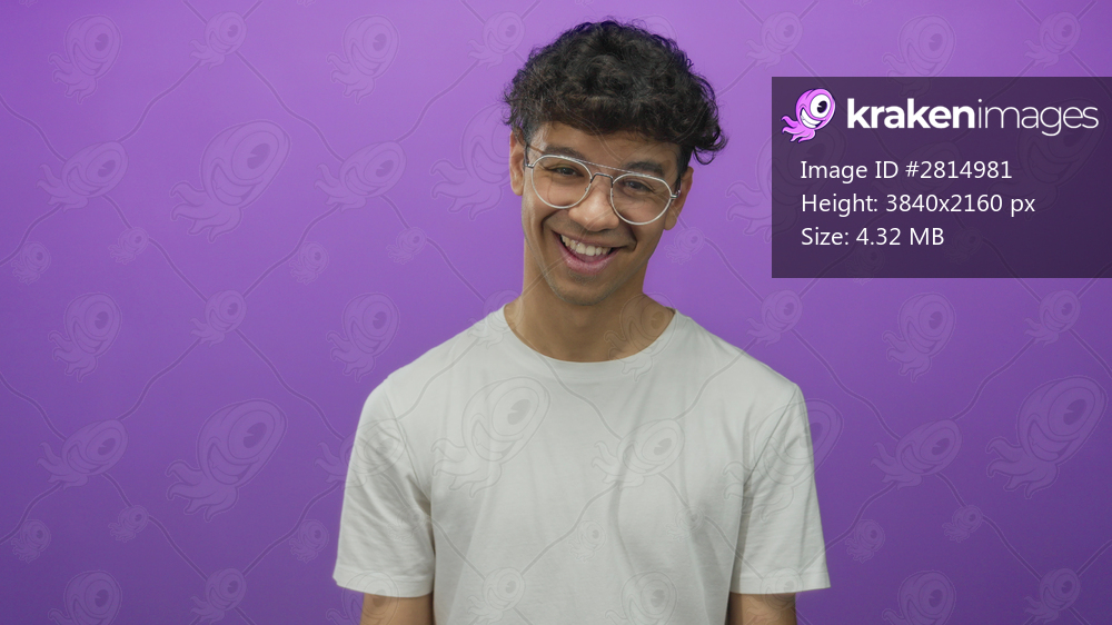 Man with glasses smiling brightly and turning his head to the side wearing a white t shirt in a purple studio; happiness.