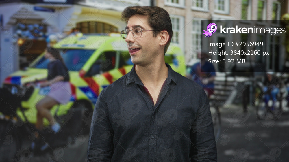 Man with glasses smiling and looking up beside a yellow ambulance on a busy street; optimism curiosity.