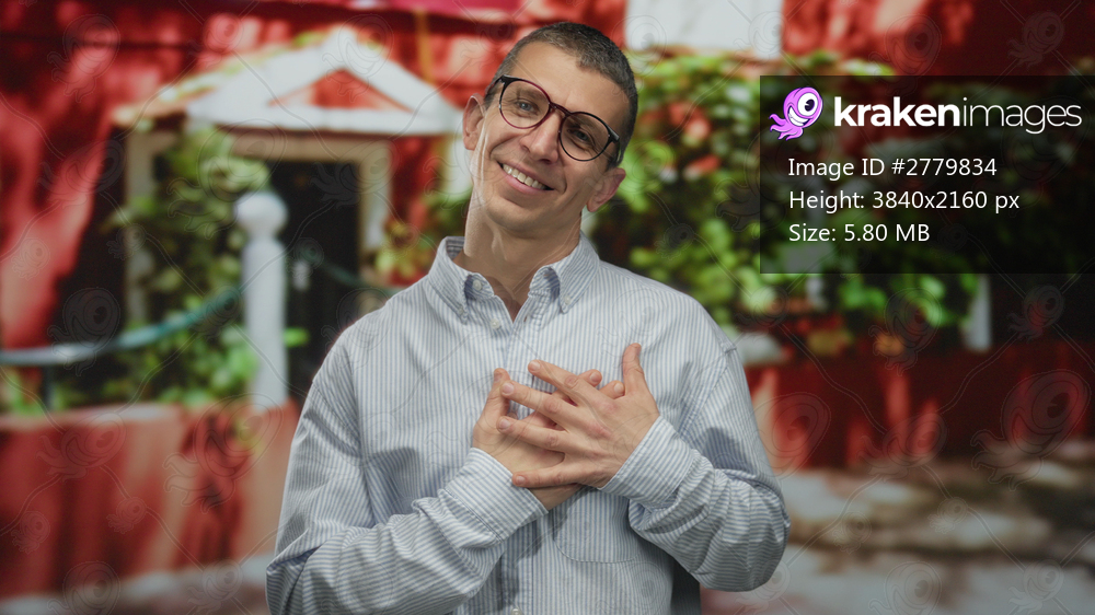 Man with glasses smiling on a sunny street with red house background, expressing gratitude and happiness in a casual setting, outdoors in bright sunlight. - Kraken Images